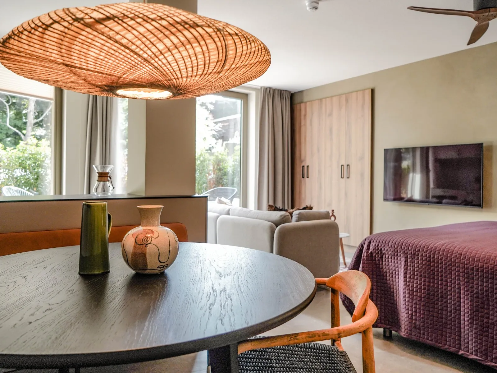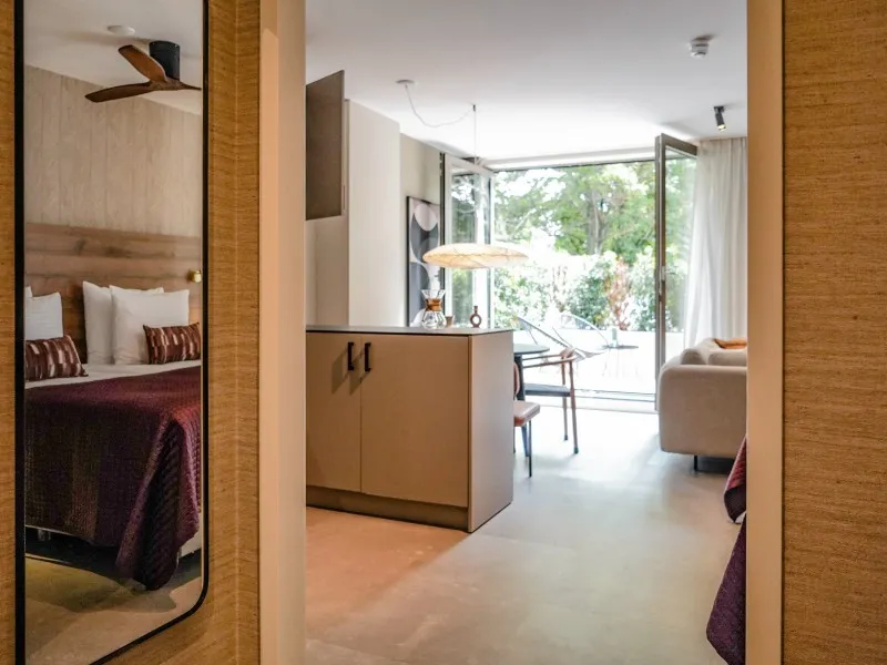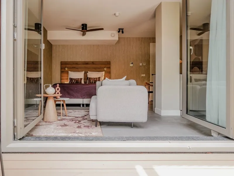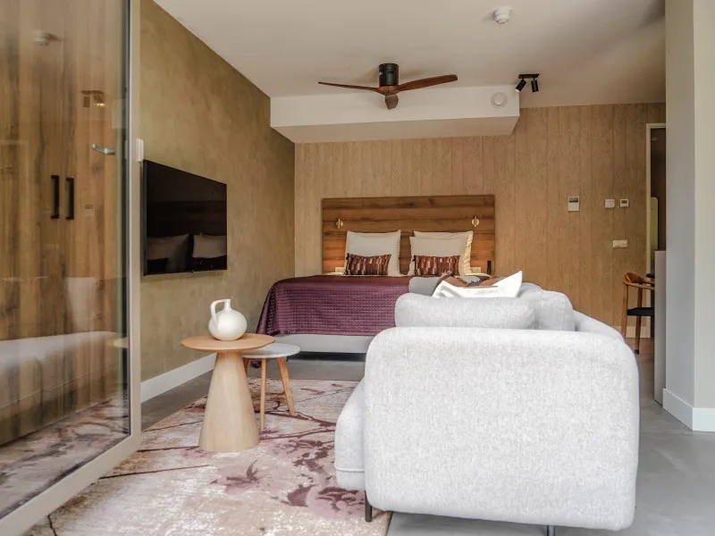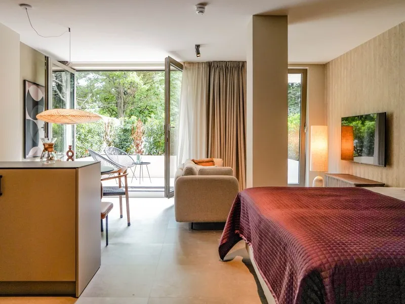 This studio apartment, designed for up to two guests, demonstrates that a 40 sqm space doesn't require compromising on comfort. It features a fully equipped kitchen, a dining area, a cozy sofa, a large SMART TV with Chromecast, a comfortable bed, a bathroom, a private washer and dryer, and a 10 sqm private terrace. You'll be pleasantly surprised by the level of comfort packed into this compact space. Whether you're on a budget-friendly business or leisure trip, this apartment is the perfect place to stay for a few days, a week, or even months. Notably, the electricity and heat you'll use during your stay are primarily generated by solar collectors, contributing to the sustainability of BizStay Walden, making it an eco-friendly building.