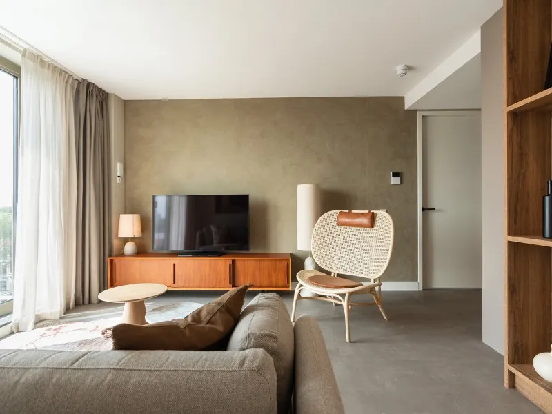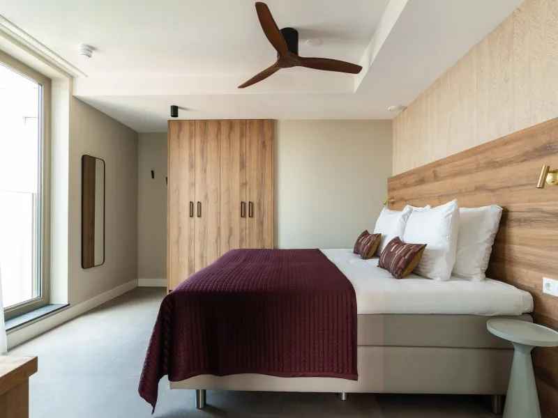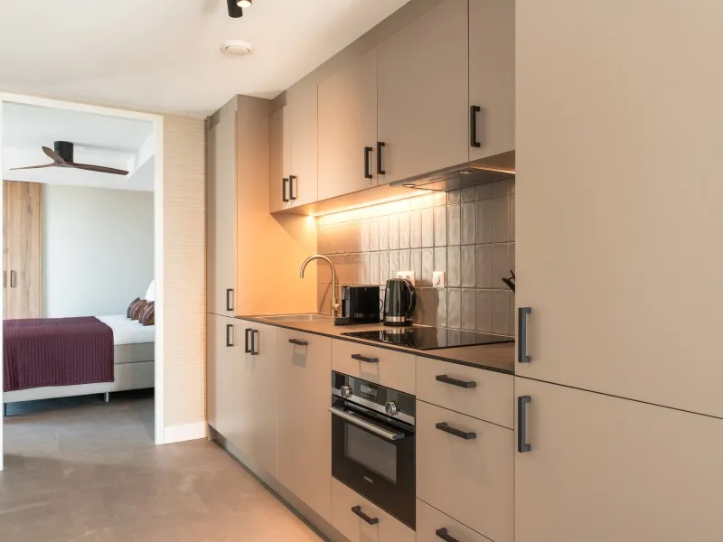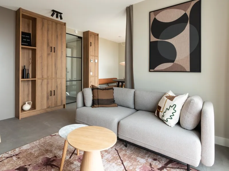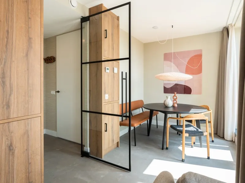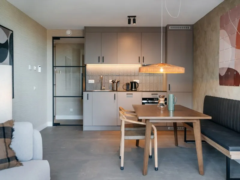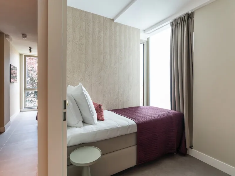 These 2-bedroom apartments, each spanning 60 sqm, provide a more compact alternative to the larger 2-bedroom units. Designed to accommodate up to 3 guests, they are perfect for smaller families or two individuals who wish to share a living space while enjoying the comfort of private bedrooms. Whether your stay is brief or extended, these apartments provide all the comfort you need. As you step inside, you'll immediately experience the inviting atmosphere consistently carried throughout the interior, marked by a harmonious blend of natural colors, materials, and contemporary technology. The apartment features a fully equipped kitchen, a dining area, a cozy sofa, and a large SMART TV with Chromecast. The master bedroom is furnished with a comfortable double bed, another SMART TV with Chromecast, a desk, and ample closet space. In the second bedroom, you'll find a comfortable full-size single bed and closet space. The spacious bathroom includes a shower, a vanity with drawers, and a heated mirror. There is a separate toilet and a laundry room equipped with a washing machine and dryer. Additionally, the apartment boasts a 4 sqm balcony. Remarkably, the electricity and heat you'll utilize during your stay are primarily generated by solar collectors, underlining the sustainability of BizStay Walden as an eco-friendly building.