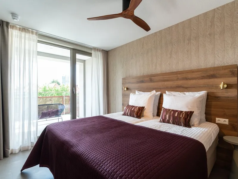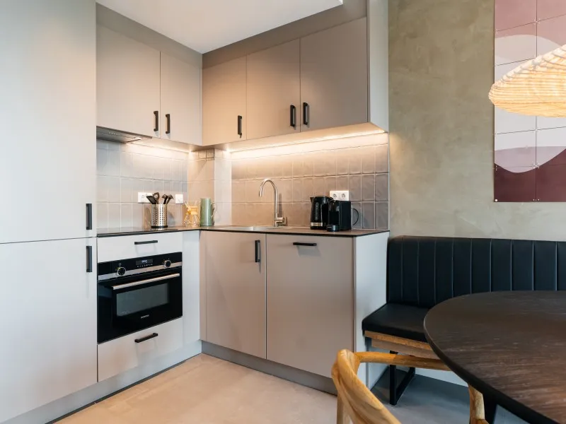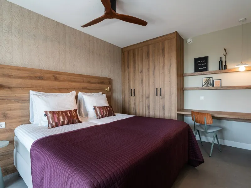 This 1-bedroom apartment, spanning 60 sqm, provides a more spacious option compared to the studio. It comfortably accommodates up to 2 guests and is suitable for both short and long stays. Upon entry, you'll immediately experience the inviting ambiance, consistently reflected in the interior design, characterized by a blend of natural colors and materials with contemporary technology. The apartment features a well-equipped kitchen, a dining area, a cozy sofa, and a large SMART TV with Chromecast. In the bedroom, you'll find a spacious and comfortable bed, a second SMART TV with Chromecast, a desk, and ample closet space. The generous bathroom includes a shower, a vanity with drawers, and a heated mirror. There's a separate toilet and a dedicated laundry room with a washing machine and dryer. The apartment also boasts a 4 sqm balcony. Notably, the electricity and heat you'll use during your stay are predominantly generated by solar collectors, contributing to the sustainability of BizStay Walden, making it an eco-friendly building.